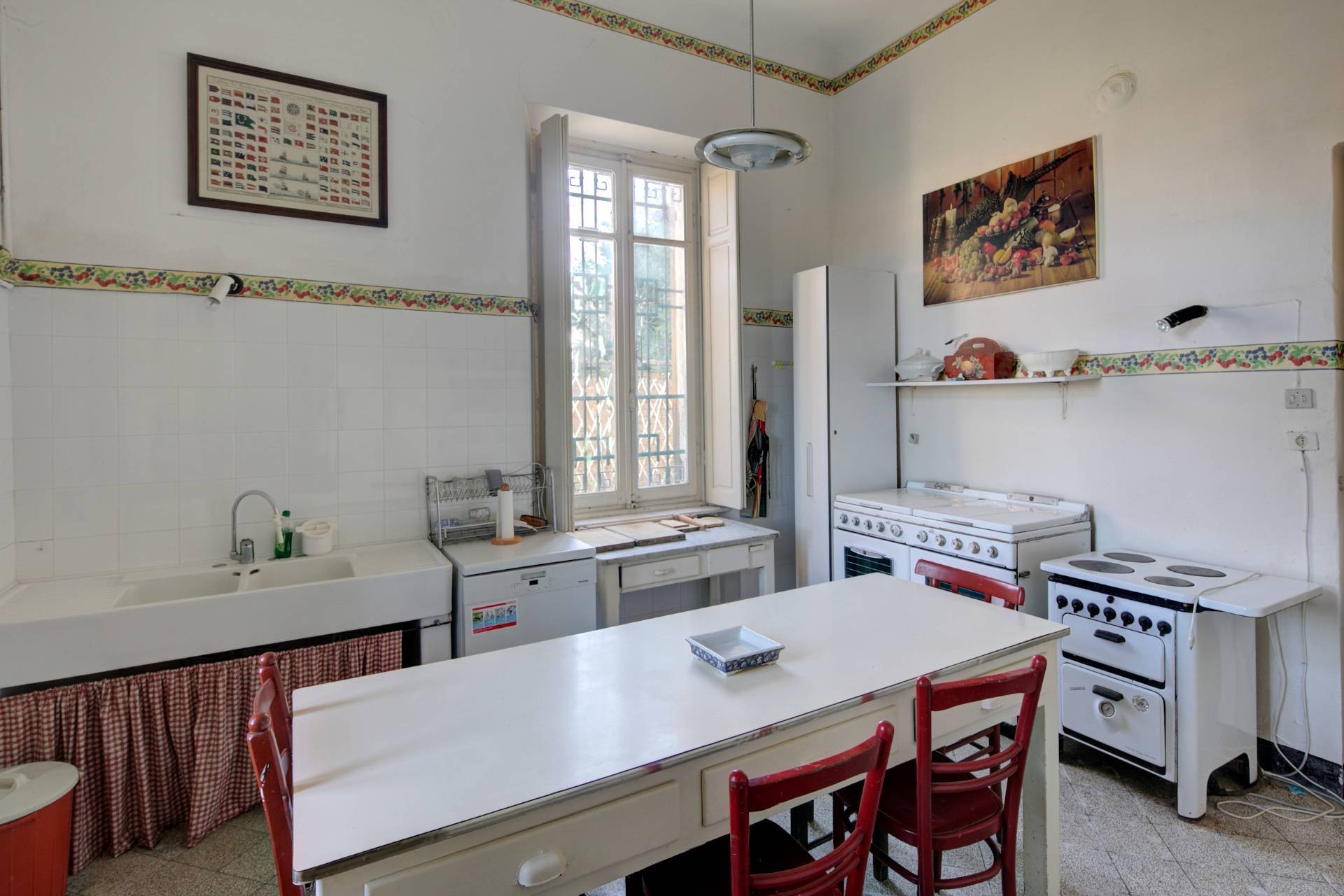 Al piano terra si trovano un ampio salone, un soggiorno con camino, la sala da pranzo, la cucina, uno studio, la tradizionale stanza da stiro e un ulteriore ambiente attualmente utilizzato come biblioteca. Sempre al piano terra, sotto la scala, sono presenti da un lato un bagno di servizio e dall'altro l'accesso alla grande cantina.