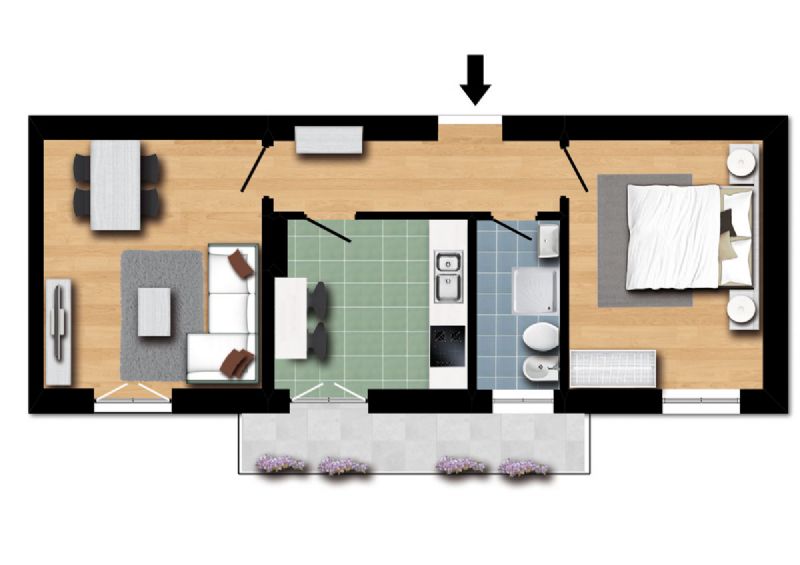L'Appartamento (con affaccio sulla Via Rivalta) è composto da: ingresso, due camere, cucina, bagno, ripostiglio, balcone, soffitta.